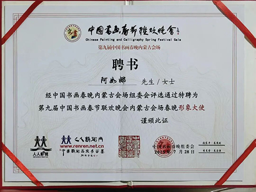 “翰墨飘香凝文脉,丹青溢彩耀北疆。”2025年12月29日,第九届中国书画春晚内蒙古分会场的舞台上,一曲《中华龙凤》声动全场——歌唱家阿如娜以澄澈婉转的嗓音,将中华传统文化的厚重与北疆草原的辽阔熔铸于旋律之中,不仅斩获“书画春晚特别贡献奖”,更被授予“第九届书画春节联欢晚会内蒙古会场春晚形象大使”荣誉。