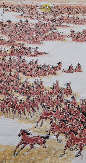 马是极具灵性的动物,广阔天地方能施展其灵性。要画出马的奔腾气势,大尺幅作品更为适宜。这不仅考验画家的技艺,更需纵览全局,避免画面枯燥,突出马的奔腾之势。徐宝铭独创的《千军万马》图,超越了传统画马的境界,并非单纯一幅画,而是一场风暴、一场竞技、一代龙马精神的生动展现。