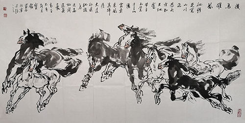 他广泛学习众多名家的技艺,博采众长,将中国书法艺术的笔法融入到画马之中。他以线为主,水墨至上,虽不刻意追求形似,却力求神似。行笔泼墨间,如行云流水般挥洒自如,作品结构严谨,气韵生动。那舒展灵动、大气奔放的骏马形象,仿佛从画中跃然而出,展现出极强的水墨张力。每一匹马都仿佛被赋予了生命,它们昂首嘶鸣,似在向天地宣告自己的存在;或奋蹄奔腾,似在追逐着心中的梦想;或低头沉思,似在思索着生命的意义。