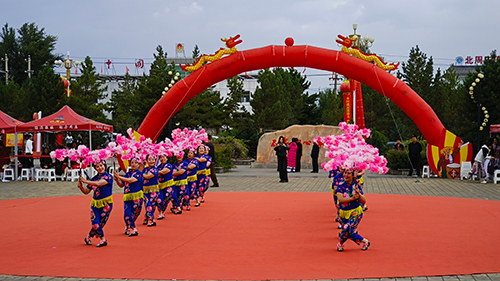 活动现场,人潮涌动,气氛热烈。北周庄镇党委书记张龙、山阴县农特产品企业商会副会长郭霖、新岱岳村党支部书记闫清如、山阴县德浩农牧专业合作社李卢山先后致辞。致辞在掌声中结束,歌舞表演随即拉开帷幕。各村文艺队身着色彩鲜艳的服装,迈着整齐的步伐,将本土农耕文化与生活热情融入舞姿,用充满乡土气息的文艺表演表达产业兴、乡村美、农民富的激动与自豪。县司法局表演队、老年大学表演队等队伍则带来风格各异的表演节目,尽显民俗风情,充满现代活力。不同的歌舞表演传递着相同的喜悦,在欢快激昂的音乐中交织。蕴含中华优秀传统文化基因的经典民俗舞曲《欢天喜地庆丰收》、展现现代农村活力的流行动感旋律《向快乐出发》,一曲曲舞蹈轮番上演,赢得现场观众阵阵掌声与喝彩,这不仅是以鲜活方式礼赞丰收,更让中华优秀传统文化在节庆交流中得以传承,让新时代农民群众在共舞中展现昂扬精神风貌。